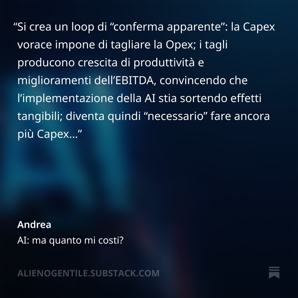 Questa newsletter ha due edizioni settimanali (ogni venerdì la Settimana dell’Alieno, e ogni mercoledì quella sulla puntata del podcast Economia per Tutti. Talvolta mi “scappa” una terza edizione sporadica, di approfondimenti specifici. Puoi trovare l’archivio integrale delle newsletter precedenti qui.