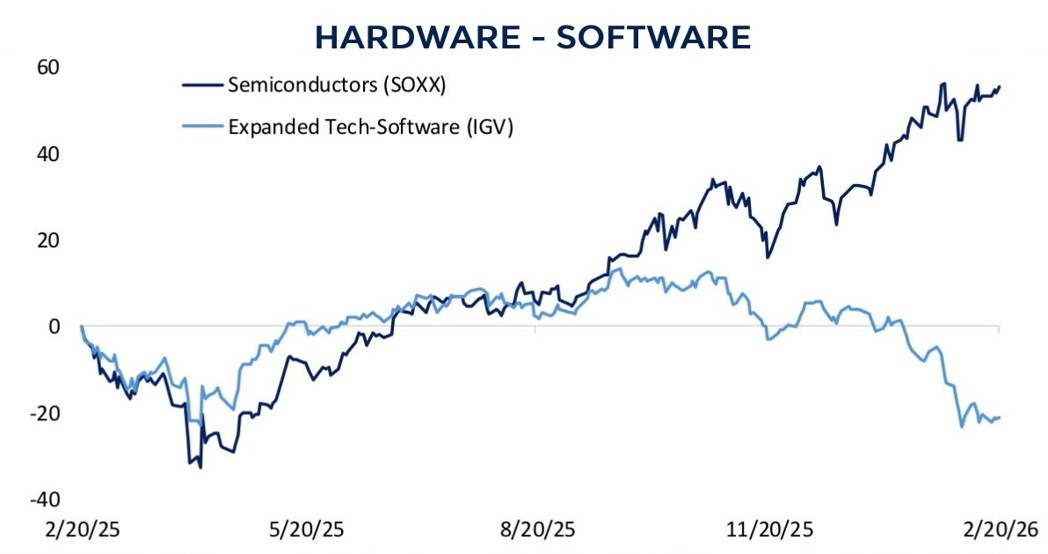 In effetti sul mercato, gli investitori temono che gli sviluppi nell’intelligenza artificiale possano minacciare il modello di business delle aziende software e si sta da tempo consolidando una divergenza fra l’andamento dell’hardware e quello del software.